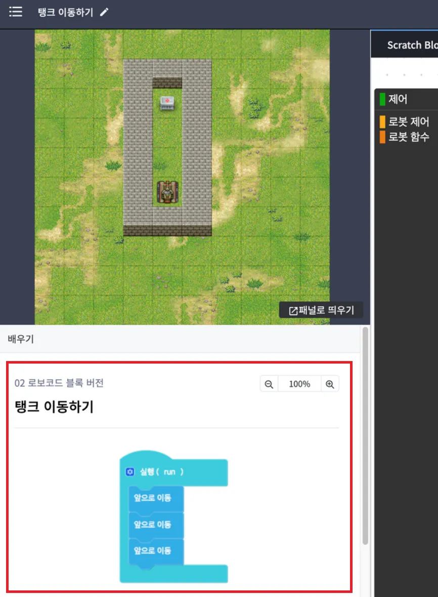 모든 강의에는 아래에 “배우기” 공간에 강의 내용이 담겨있습니다. 해당 내용을 따라 하시다 보면 금방 로봇을 자유자재로 움직일 수 있을 거예요.