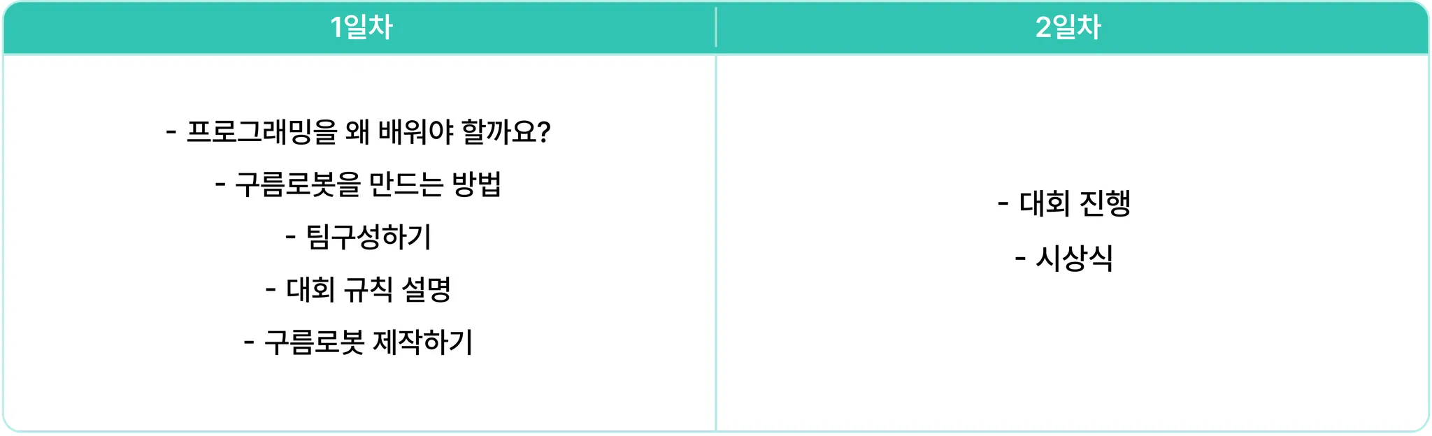 첫째 날에 프로그래밍을 배우는 이유, 블록코딩으로 구름로봇 만들기 등 다양한 교육이 준비되어 있습니다.